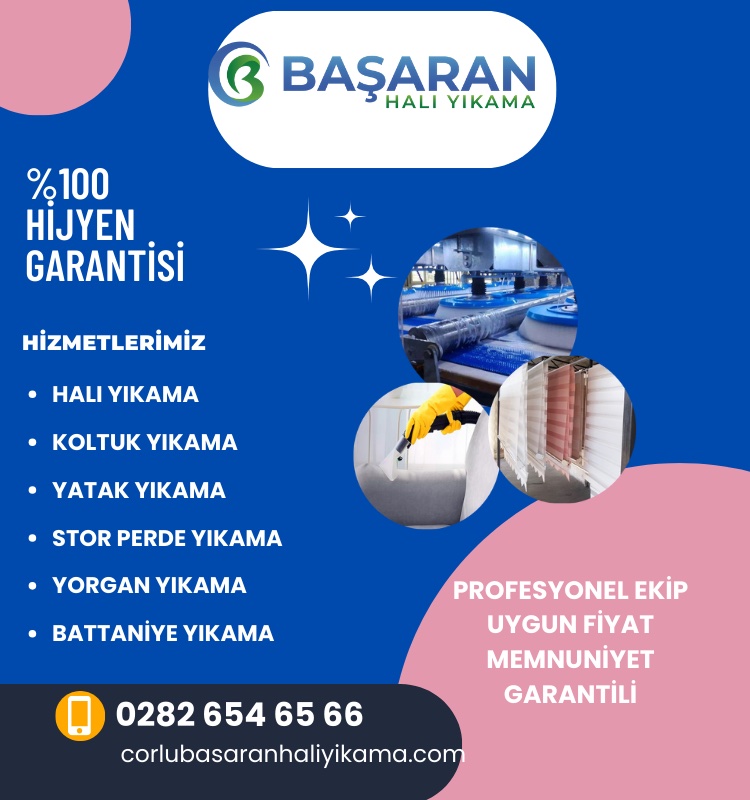 Başaran Halı Yıkama olarak Çorlu’da 2015 yılında kurulduk. Kurulduğumuz günden bu yana ilkeli ve profesyonel hizmet anlayışımız ile siz değerli Çorlu halkına destekler sunuyoruz. Temizlik, yıkama alanlarında her zaman teknolojiyi ve dünyayı takip ediyor yeni gelişmeleri firma bünyemize katıyoruz. Başaran halı yıkama olarak halı temizliğinin yanı sıra pek çok hizmet veriyoruz. Bu alanda kendimizi geliştirerek Çorlu bölgesine kesintisiz hizmetler sunma adına çalışmalara ağırlık veriyoruz. Halı yıkama ve diğer tüm hizmetlerde insan gücünden yararlansak da halıların yıkanması, kurutulması için özel olarak makineler kullanıyoruz. Başaran Halı Yıkama olarak verdiğimiz hizmetleri; Çorlu halı yıkama, Koltuk yıkama, Yorgan ve battaniye yıkama, Stor perde yıkama ve yatak yıkama şeklinde sıralayabiliriz. Tüm bunların yanı sıra hizmet anlayışımız her zaman kaliteyi sunmaya yöneliktir. Halı yıkama ve diğer tüm operasyonlarda en iyisini sunuyoruz. Halı yıkamalarda halılarınızı adresinizden alarak en kısa sürede geri tertemiz şekilde teslim etmekteyiz. Koltuk ve yatak yıkama hizmetlerinde de uzunca süredir yerinde hizmetler sağlıyoruz.